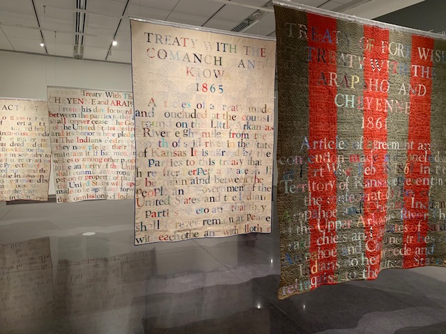 University of Colorado Boulder Art Museum is exhibiting “Its Honor Is Hereby Pledged” by Gina Adams, which brings together four installations exploring the complicated history and present-day relevance of treaties between the U.S. government and indigenous peoples, and promoting healing of inherited trauma.