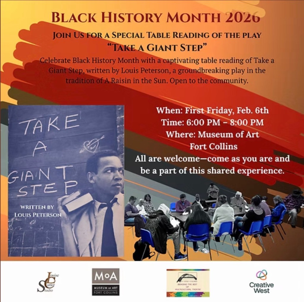 Feb. 6 Table reading of Louis Peterson’s groundbreaking play Take a Giant Step co-sponsored by Museum of Art Fort Collins, Louise Cutler Studio Community Art Projects, and others. 6 p.m. Open to the community. Free