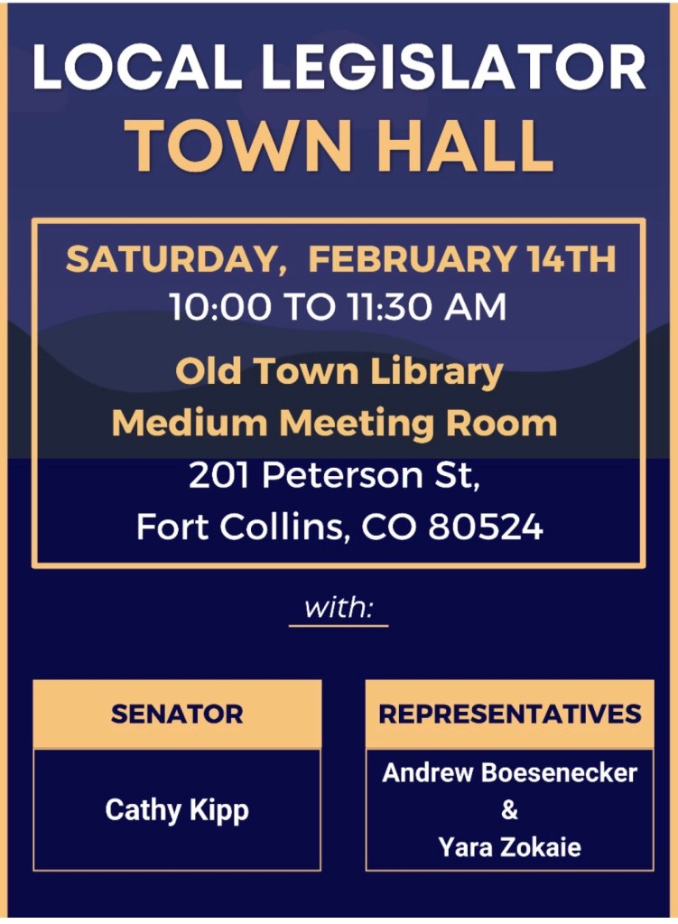 From Sen. Cathy Kipp: “Our next Local Legislator Town Hall is happening the morning of Feb. 14, with Senator Cathy Kipp and Representatives Andy Boesenecker & Yara Zokaie. Please join us to learn about what is happening at the Capitol and have your questions answered. Please be aware that, due to occupancy capacity and fire codes, seats will be limited to the first 80 people. We are working on getting larger spaces.”