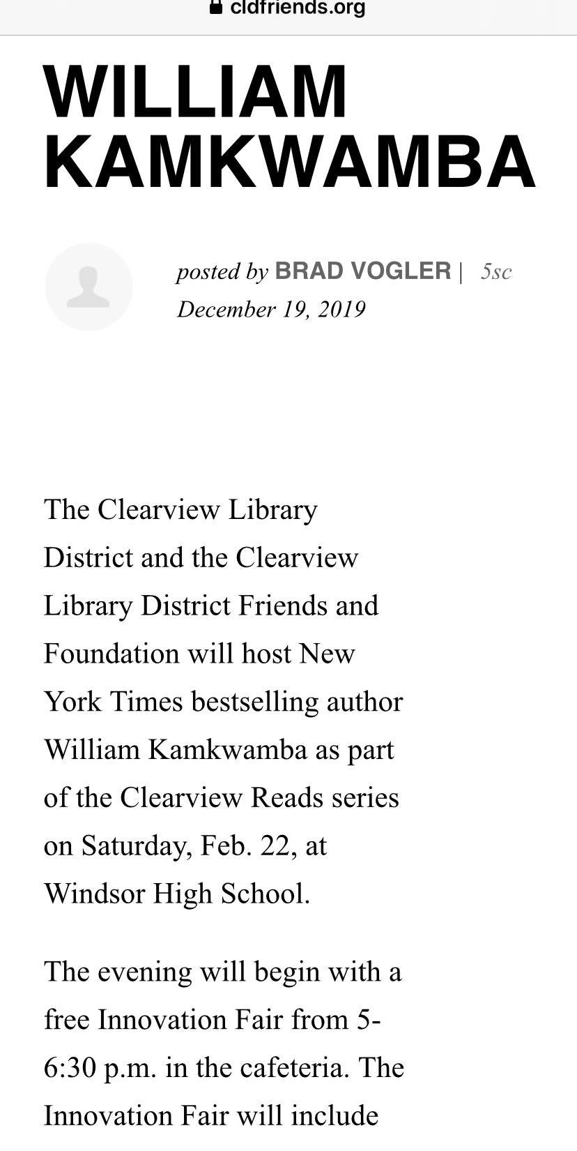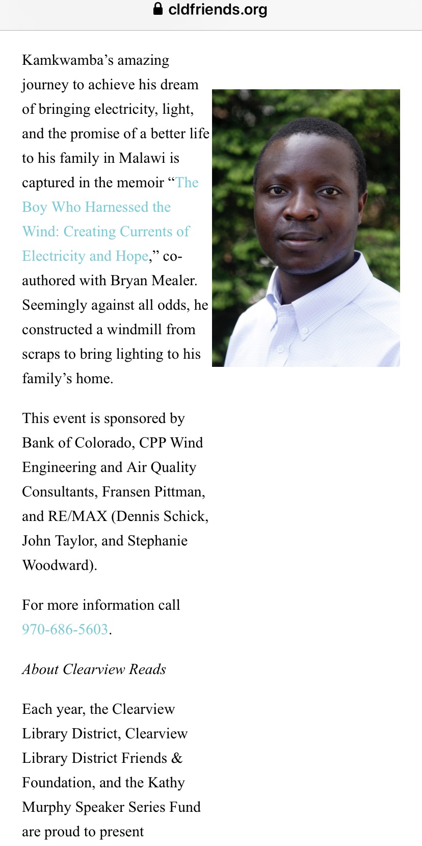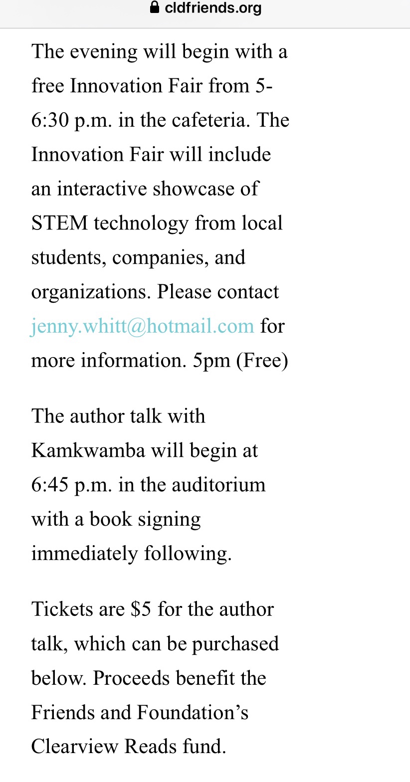 Enter this drawing to win two FREE tickets to the Clearview Reads event on Saturday, Feb. 22 featuring The Boy Who Harnessed The Wind author William Kamkwamba at Windsor High School!