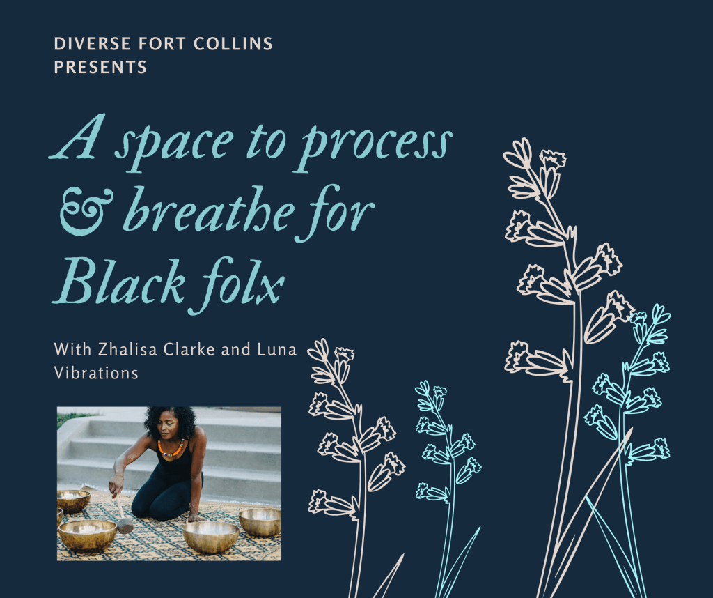 Diverse Fort Collins invites you to this space to process and breath and find healing space in meditation with other Black folx. Zhalisa Clarke of Luna Vibrations will lead us in a meditation and invitation to process in community.
